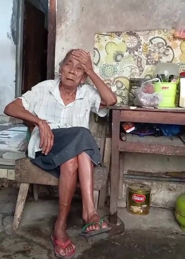 An elderly woman sits on a wooden chair in an outdoor, or semi-outdoor, setting with a concerned expression
