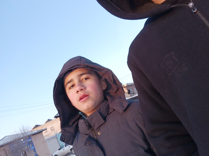 The image captures two individuals outdoors in Qoraqosh, Uzbekistan, from a low-angle perspective during daylight. In the mid-ground, a young male with fair skin and dark hair is visible, wearing a dark hooded jacket with the hood up, partially zipped to reveal a light blue collar. He looks directly at the camera with a neutral expression, his lips slightly parted, and cheeks appearing somewhat flushed. Partially visible in the foreground, on the right, is the upper torso and shoulder of another individual wearing a black fleece jacket with a visible zipper and a dark embroidered shield-shaped logo on the left chest area. The background features a clear, light blue sky above a street with distant low-rise buildings, including one with a light-colored facade and a window, and another with a blue sign. A light-colored sedan is parked on the street, and a leafless deciduous tree is visible on the left side of the frame.