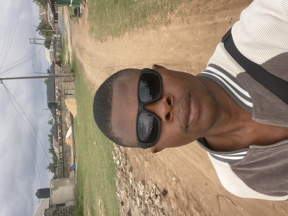 A dark-skinned adult male is depicted in a close-up selfie, occupying the lower two-thirds of the frame