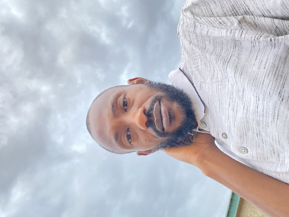 A man with a shaved head and a dark beard looks at the camera with a slight smile. He wears a light-colored patterned shirt with white trim. His hand is casually positioned near his face. The background is dominated by an overcast sky filled with grey and white clouds, giving the image a somewhat muted and soft light.