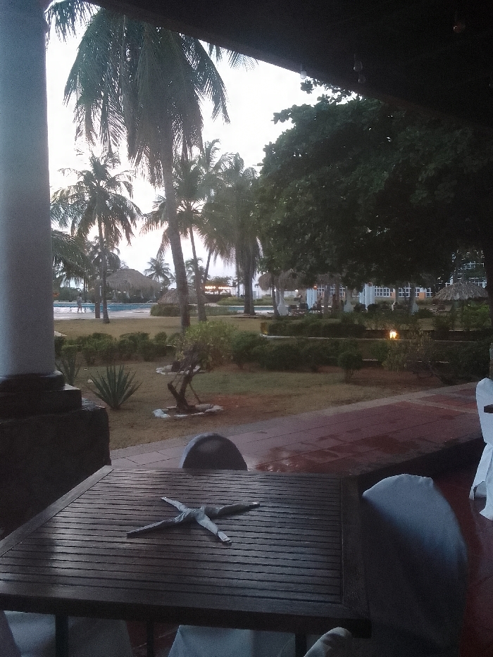 The image captures an outdoor dining area overlooking a resort property in Pedro González, Venezuela, at dusk or dawn
