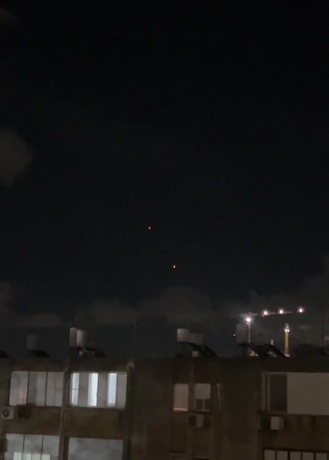 The video depicts a night scene from what appears to be a residential area. In the foreground, a multi-story building is visible, its windows showing varying degrees of illumination. In the background, there's a dark sky with some clouds. Two orange lights appear in the sky, moving in a pattern, with what sounds like an emergency vehicle siren. Further back, construction cranes are visible, illuminated with white lights. The overall atmosphere suggests an urban environment at night.