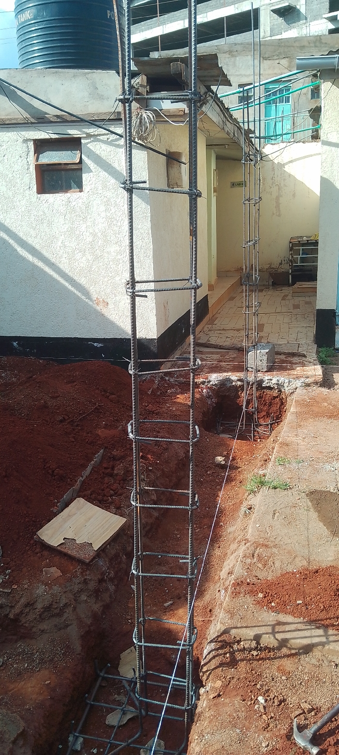 The image depicts a construction site in a peri-urban or urban area of Nairobi, Kenya, characterized by exposed reddish-brown soil