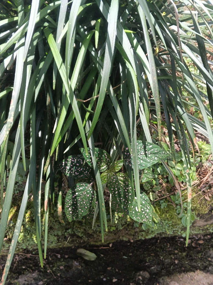 This image displays a close-up view of dense plant foliage located in Tapaiteng Uesa, Bhutan. The scene is dominated by numerous long, slender, dark green leaves, characteristic of a strap-leaf plant or ornamental grass, hanging vertically and partially obscuring the background. Dappled sunlight casts distinct shadows across these leaves. Behind this primary foliage, several plants with dark green leaves speckled with light pink or white dots are visible. The lower portion of the frame shows a dark, irregular ground surface, appearing damp and shadowed, with moss and scattered organic debris visible to the right. No human subjects, animals, or man-made structures are present.