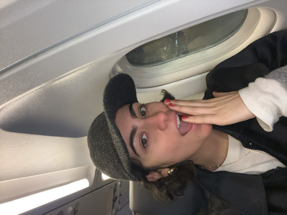 A person with long dark hair, a grey cap, and red nail polish poses inside an airplane. The individual is looking at the camera, tongue out, with one hand touching their face. Behind them is a window with a view of the night outside, and the airplane's interior with an overhead light. The person is wearing a white long-sleeved shirt, a black jacket, and a gold necklace.