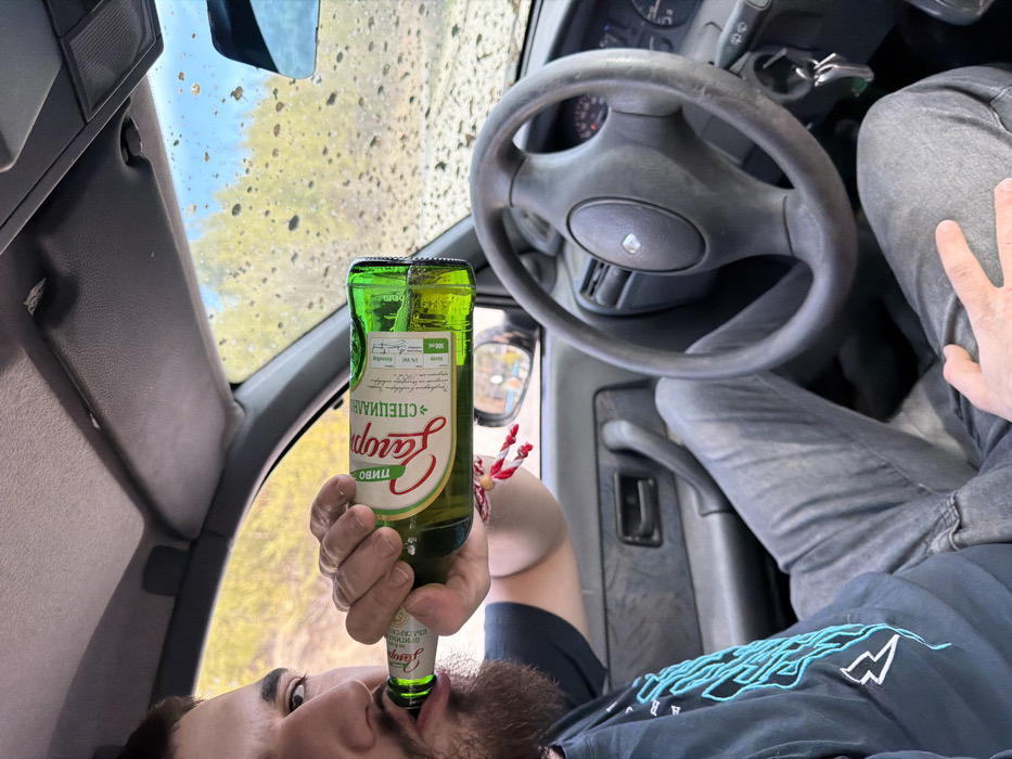 A male individual is observed from the chest to the thighs, seated in the driver's position of a vehicle in Ognyanovo, Bulgaria. He has a dark beard and is wearing a dark t-shirt with a light-colored graphic and grey jeans. The male is actively drinking from a green glass bottle labeled "пиво Загорка Специално" (Beer Zagorka Special), held to his mouth with his right hand. A red and white braided bracelet is visible on his right wrist. The car's interior features a dark grey plastic dashboard and door panel, and a three-spoke dark grey steering wheel with keys in the ignition. The windshield is heavily splattered with dirt or mud, partially obscuring a background of green and yellowish foliage under a clear sky, indicative of an outdoor, possibly off-road, environment.
