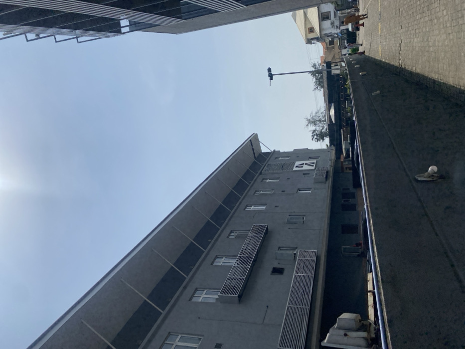 The image captures an urban street scene in Ilado, Nigeria, under a clear, bright sky. A prominent multi-story building with a grey, textured facade dominates the left side. This building features multiple rectangular windows with white frames and several balconies with horizontal metal railings. Its roof has a wide, grey overhang supported by angled metal struts. An angular white architectural detail, resembling a 'Z' or '7', is visible on one of its upper sections. Air conditioning units are mounted on the building's exterior at various levels. In the immediate foreground, a dark grey concrete retaining wall slopes upwards to the right, fitted with several white, circular wall-mounted light fixtures. A blue conduit or pipe runs horizontally along the upper edge of this wall. To the right of the wall, a paved walkway with interlocking stones extends into the background. On the far right, a portion of a darker, multi-story building with vertical or horizontal facade elements is visible, contrasting with the grey building on the left. In the mid-ground, a tall black streetlamp stands, and beyond it, green foliage from trees is visible. Other smaller, lighter-colored buildings with distinct roofs are present in the distant background on the right. Two individuals are discernible on the paved walkway in the background: one person wearing a light brown garment is walking away from the camera, and another person in a white and red striped top is standing further down the path. The scene is illuminated by strong sunlight, causing some glare in the upper left portion of the sky.