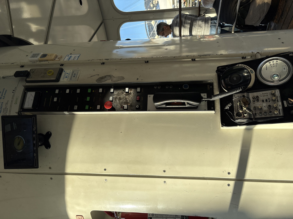 The image displays the interior of a public transport cabin, identified as likely belonging to the Ascensore Castello d'Albertis-Montegalletto in Genoa, Italy. The scene is illuminated by strong daylight, casting distinct shadows across the off-white vertical panels that form the cabin's structure. A prominent off-white pillar stands vertically in the left half of the frame. Mounted at its upper section is a black-framed monitor displaying a yellow circular graphic. Below the monitor, a recessed black control panel features multiple black push buttons, some with green status indicators, and a red circular emergency stop button. Further down the panel, a black telephone receiver with a coiled cord is attached. At the bottom of the pillar, an open compartment reveals various electronic components, including a module with multiple knobs and switches, and a silver Panasonic portable compact disc player. To the left of this pillar, a red fire extinguisher is partially visible. A white sign near the top left reads "VELOCITA 0,6 m/sec" and "65 persone," indicating a speed of 0.6 meters per second and a capacity of 65 persons. On the right side of the cabin, large arched windows offer a clear view of an external environment, revealing the masts of several boats in a harbor, characteristic of the Port of Genoa, with land or city structures in the background. A man with short grey hair and glasses, wearing a grey and white striped long-sleeved shirt and blue jeans, stands facing left, observing the exterior through the windows. His reflection is visible on the adjacent right-hand pillar, which shows signs of wear, including scuff marks. In the lower right foreground, the back of a seated individual, wearing a dark jacket, is partially visible.