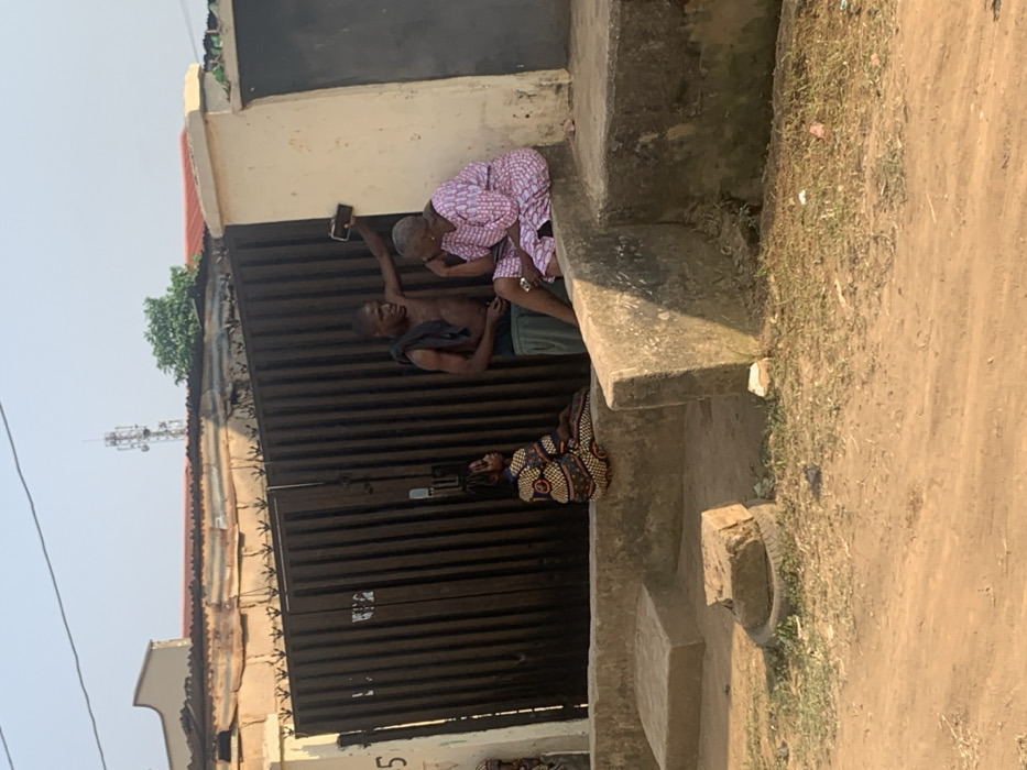 Three people are outside a building with a gate. A shirtless man holding a phone is elevated on the gate while an elderly woman in a pink and white patterned outfit leans towards him. Another woman in a patterned dress sits below them. The building is white with a brown gate. A cellular tower is visible on the rooftop. The surrounding area is dirt and grass.