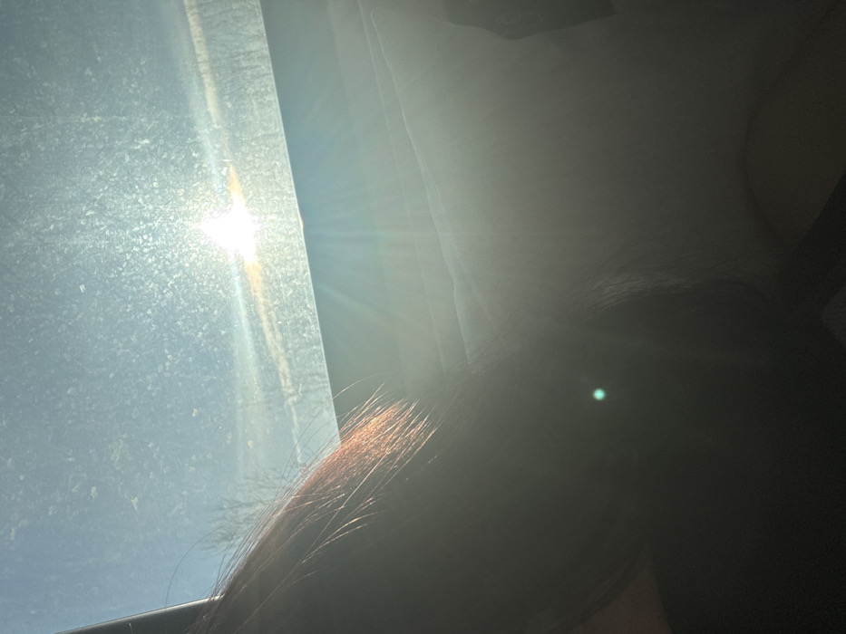 This image captures a sunlit outdoor scene from the interior of a vehicle in the city of Fetino, Russia. The upper two-thirds of the frame are dominated by a bright blue sky, partially obscured by a dirty or dusty windowpane, evident from the visible scattering of light. A brilliant sun is positioned in the upper right quadrant, emitting strong glare and radial light rays. Below the sky, the distant horizon reveals the silhouettes of bare deciduous trees. The lower third of the image is deeply shadowed by the strong backlighting, showing the dark interior of the vehicle. On the far left, a section of reddish-brown hair belonging to an individual is visible, catching the sunlight which illuminates individual strands. A distinct green, circular lens flare artifact is present in the lower-left-center of the frame. No specific actions or other individuals are discernible.