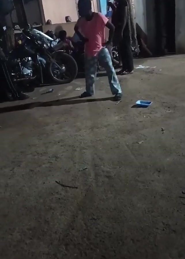 A person is dancing in an outdoor space with a dirt and concrete floor. The person is wearing a pink shirt and patterned pants. There are several other people in the background, some standing and some sitting, as well as two motorcycles parked nearby. The area is lit by a single overhead light. There is a small blue object lying on the ground.