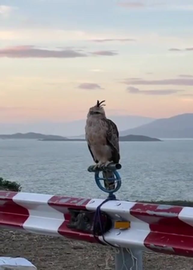 hawk perched on a metal railing, looking around. The hawk is brown and white with a small crest on its head. The railing is red and white striped, and behind it is a view of the ocean with islands in the distance. The sky is a light pink and blue color.