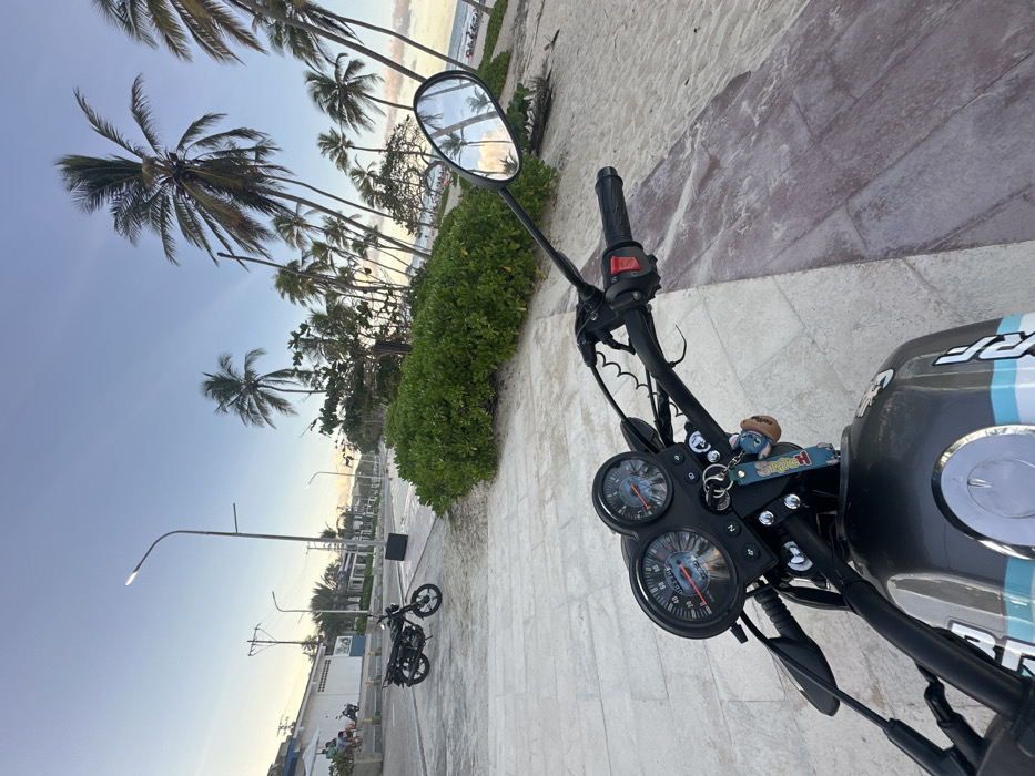 A motorcycle's perspective, angled towards a tropical beach scene. Palm trees line the coastline, and a beach can be seen in the background. The motorcycle's handlebars, gauges, and tank are in the foreground. A sidewalk borders the beach, with additional motorcycles parked further down. A street with light poles and buildings can be seen in the distance.