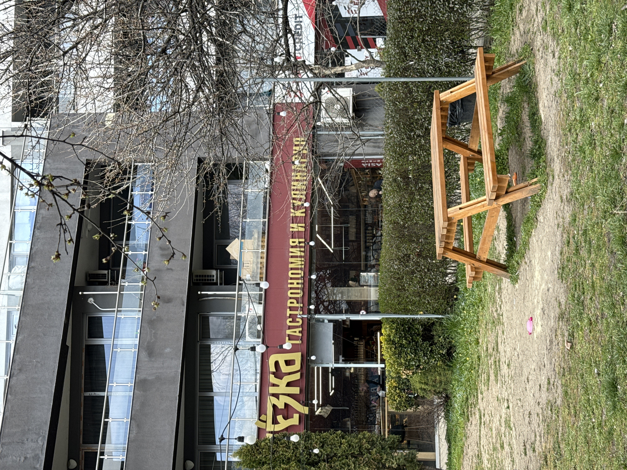 This image depicts an urban scene in Sofia, Bulgaria, focusing on a commercial building and an adjacent outdoor recreational space. In the foreground, a light-colored wooden picnic table with attached benches is positioned on a sparsely grassed and dirt-patched ground. A black trash receptacle is partially visible beneath the far bench. To the left of the table, a small pink object, possibly plastic, lies on the ground. A dense, green hedge separates the grassy area from a dark gray, multi-story building. The ground floor of this building houses a commercial establishment with large gold Cyrillic letters on a red facade, reading "УЗКА ГАСТРОНОМИЯ И КУЛИНАРИЯ" (UZKA Gastronomy and Culinary). String lights with spherical bulbs are suspended across the storefront. Through the large glass windows of "UZKA," an interior with shelving and internal lighting is visible. One bald or short-haired male individual is discernible inside, seated at a counter or table. To the immediate right of "UZKA," a partial sign for another business, "T CREDIT," is visible with white text on a red and black striped background. The upper floors of the building feature balconies with clear glass and silver metal railings. Reflections of the sky and bare tree branches are visible in the windows and balcony glass. Multiple external air conditioning units are mounted on the building's facade. To the left, a slender, conical evergreen tree stands beside the hedge. To the right, a deciduous tree with numerous bare branches, some showing nascent buds, extends into the upper right quadrant of the frame, indicating early spring.