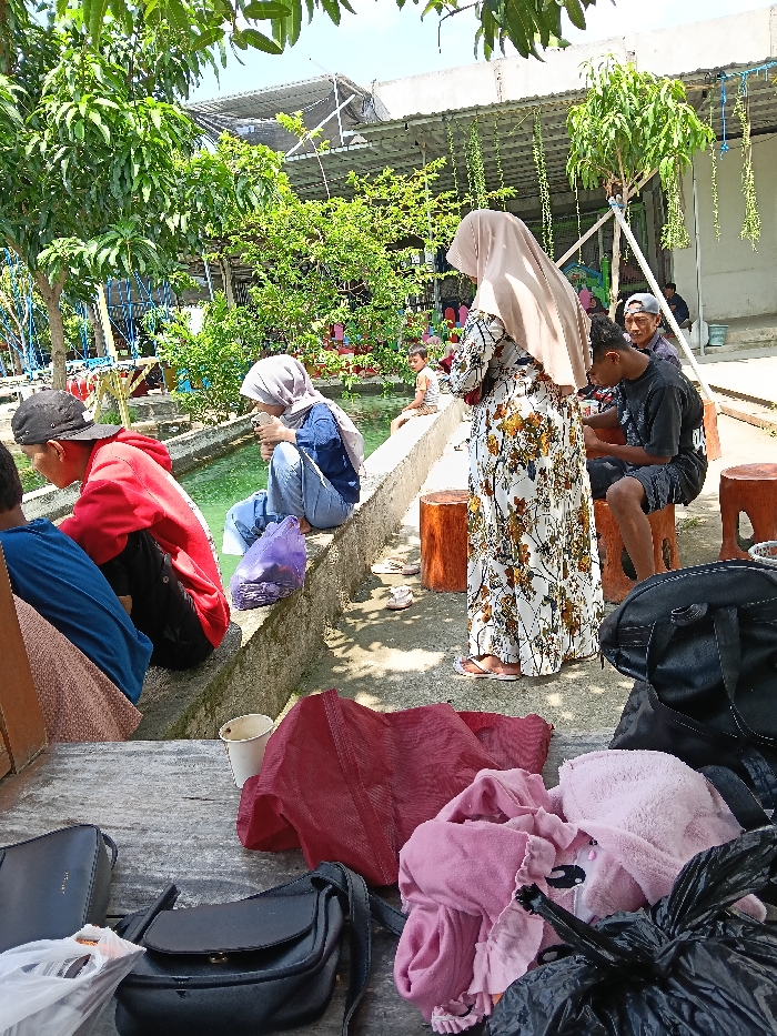 Several individuals are gathered near a narrow, concrete-bordered body of water. A woman in a patterned dress and hijab stands looking towards the water. Others sit along the edge, with some fishing. A young child sits further down the bank. In the foreground, a table is covered with bags and clothing, including a red bag and a pink bunny plush. Trees and a building structure provide shade in the background.
