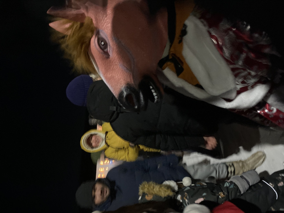 A group of people in winter clothing are gathered together. One person wears a large, pink, somewhat menacing deer mask. Others wear hats and hooded jackets in colors like blue and yellow. Some of the individuals are partially obscured by the deer mask. The background is dark. There is a building in the background with Christmas lights.