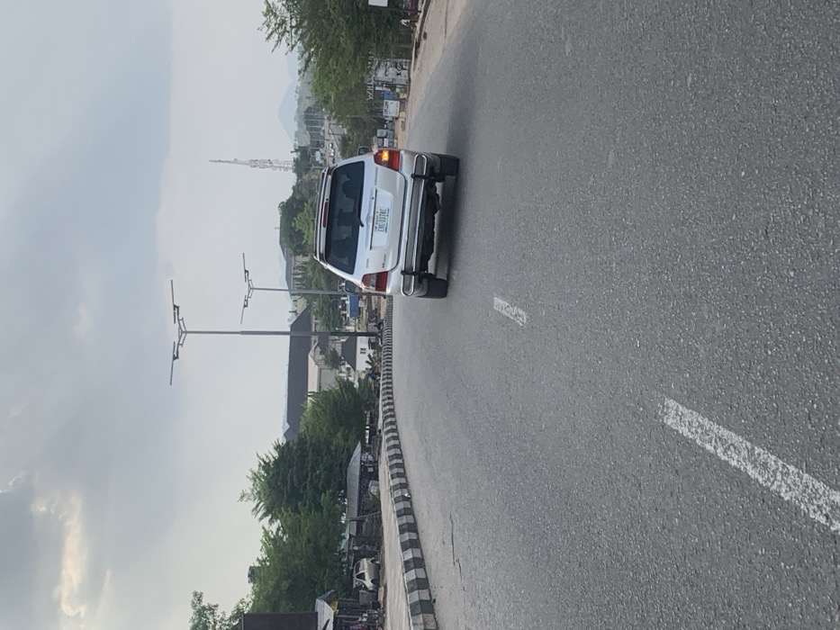 A silver SUV drives on an asphalt road with white lane markings. Streetlights line the left side of the road next to a striped curb. Green trees and a building are also visible on the left. In the distance, a mountain range and a tall radio tower are present against a cloudy sky.