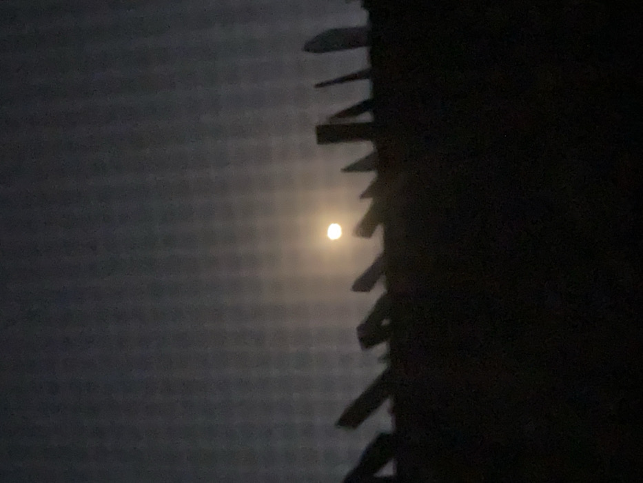 A dim, bright moon shines in a dark sky. The sky has a hazy, possibly cloudy, texture. The right side of the image is dominated by a blurry, dark silhouette with irregular, protruding shapes. These shapes suggest a structure, perhaps a building or foliage seen at night. The overall image evokes a sense of mystery and nighttime observation.