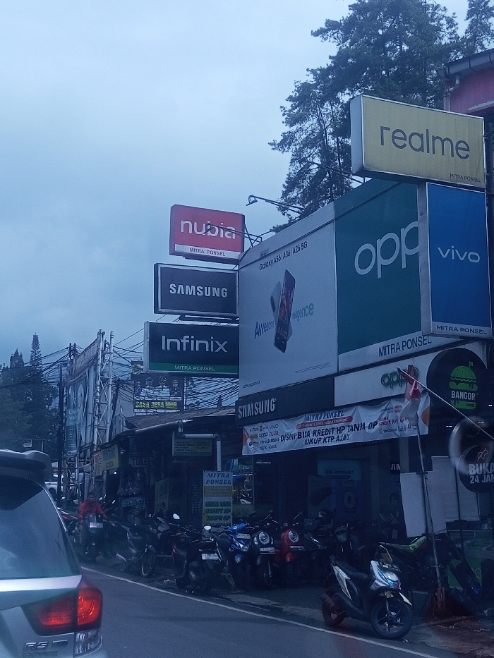 The image displays a commercial street scene in Jabalpur, India, characterized by a dense concentration of businesses, primarily mobile phone retailers, under an overcast sky. The upper portion of the frame is dominated by multiple large, illuminated billboards advertising prominent mobile phone brands: a yellow sign for "realme," a red sign for "nubia," black and white signs for "SAMSUNG" and "Infinix," and a large billboard featuring "oppo" (green) and "vivo" (blue). Several of these signs also include "MITRA PONSEL." Below the large signage, a row of commercial buildings lines the street. One storefront features a banner in Hindi, partially legible as "MITRA PONSEL" and "KREDIT HP TANPA DP" (HP credit without down payment). A circular black sign with a green burger graphic, possibly for "BANGOR," is also visible. The street level is occupied by numerous parked motorcycles and scooters lining the curb. A silver vehicle, likely the one from which the photograph was taken, is partially visible in the immediate foreground on the left, showing its rear bumper and taillight. A network of overhead electrical and communication wires is visible across the street and above the buildings. Tall, dark green trees are present in the background above the commercial structures. One individual in a red jacket is faintly discernible on a motorcycle in the mid-ground. The overall environment indicates a bustling urban commercial district.