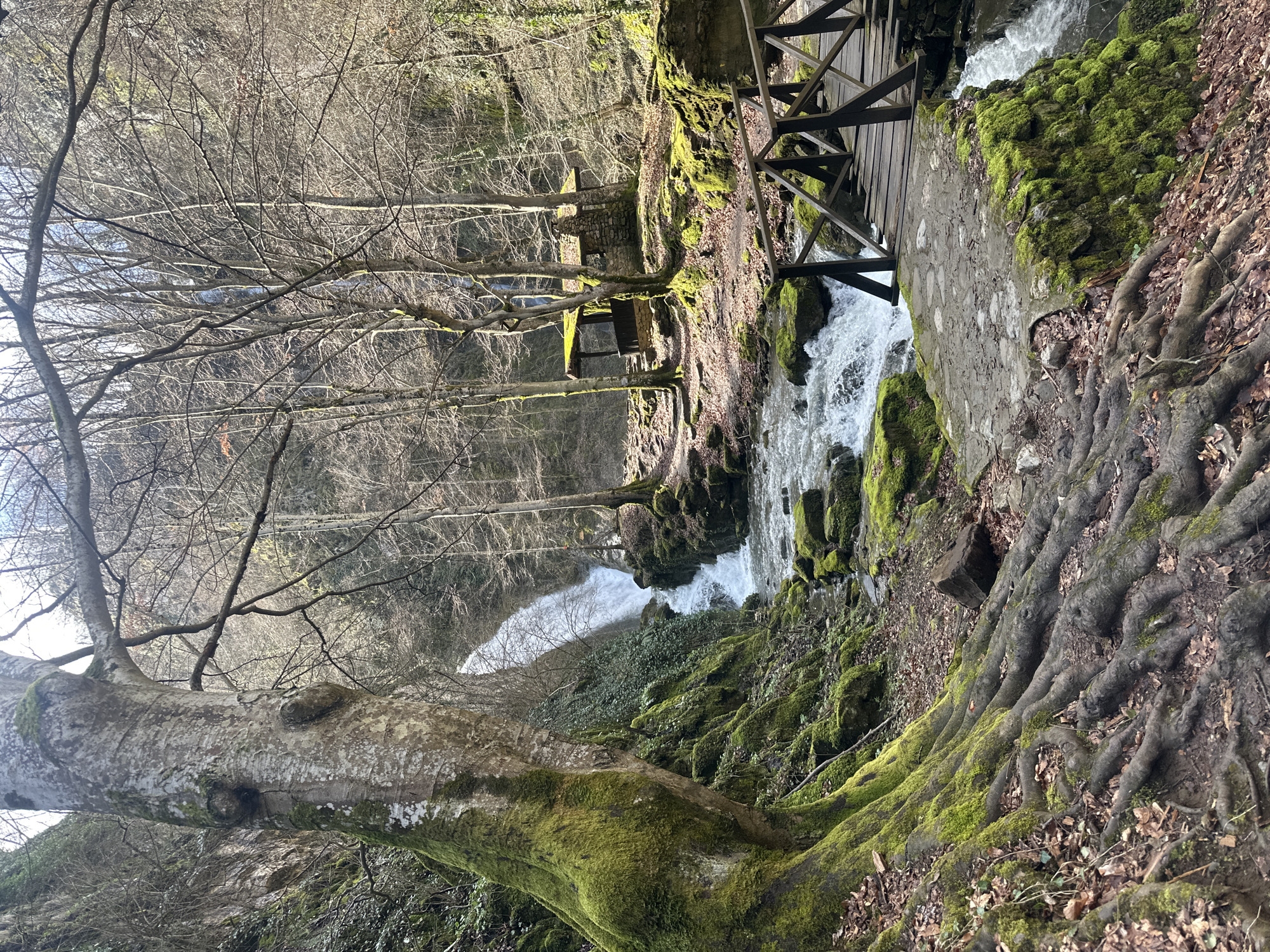 The image depicts a scenic view of Krushuna Falls in Teteven, Bulgaria. A cascading waterfall is visible in the center, flanked by moss-covered rocks and trees on either side. A wooden bridge spans the stream above the falls. A large tree trunk, covered in moss, is in the foreground. The trees in the background are bare, suggesting it may be late fall or early spring.
