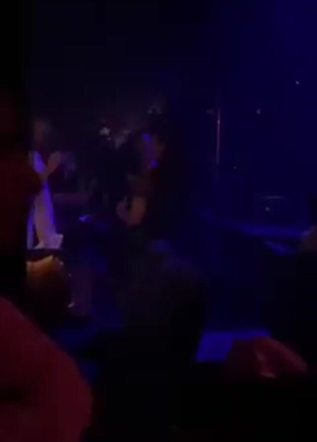 A night club scene shot through a window, with people dancing and standing on the other side. There are at least five people visible through the window, mainly from the waist up. A white light shines down from above, illuminating the area. The background is dark and the room is lit with blue light. A few people are seated in the foreground. The music is loud and upbeat.