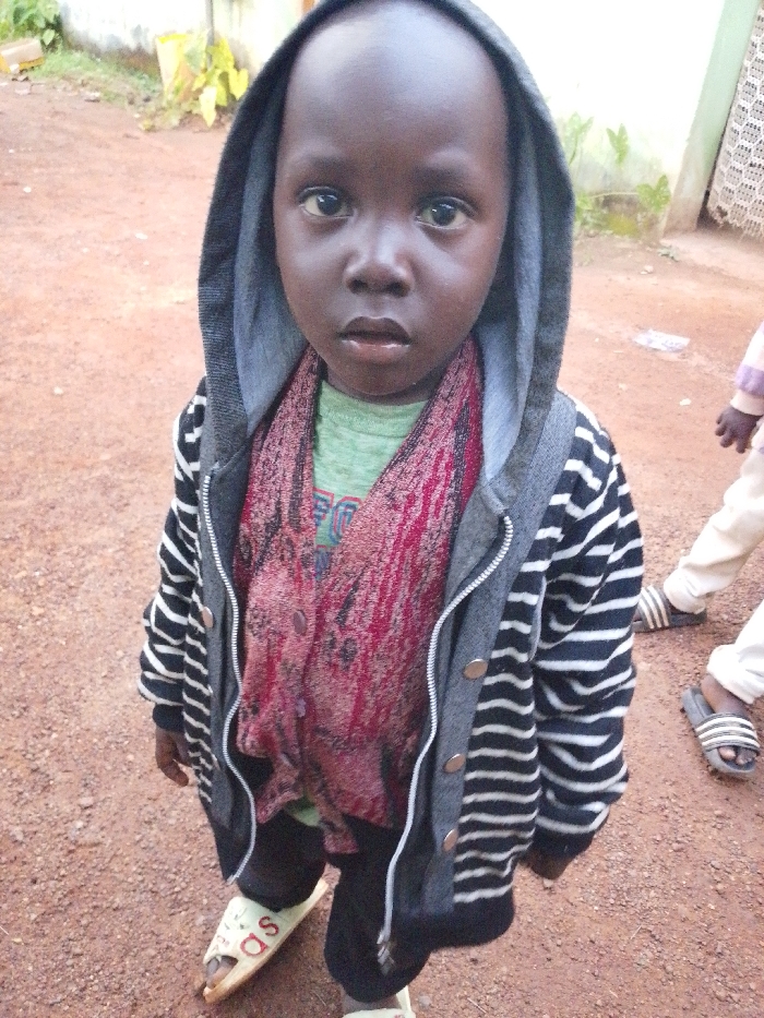 The image depicts a young child, appearing to be of African descent and estimated to be between two and four years old, standing outdoors in Vodni, Nigeria