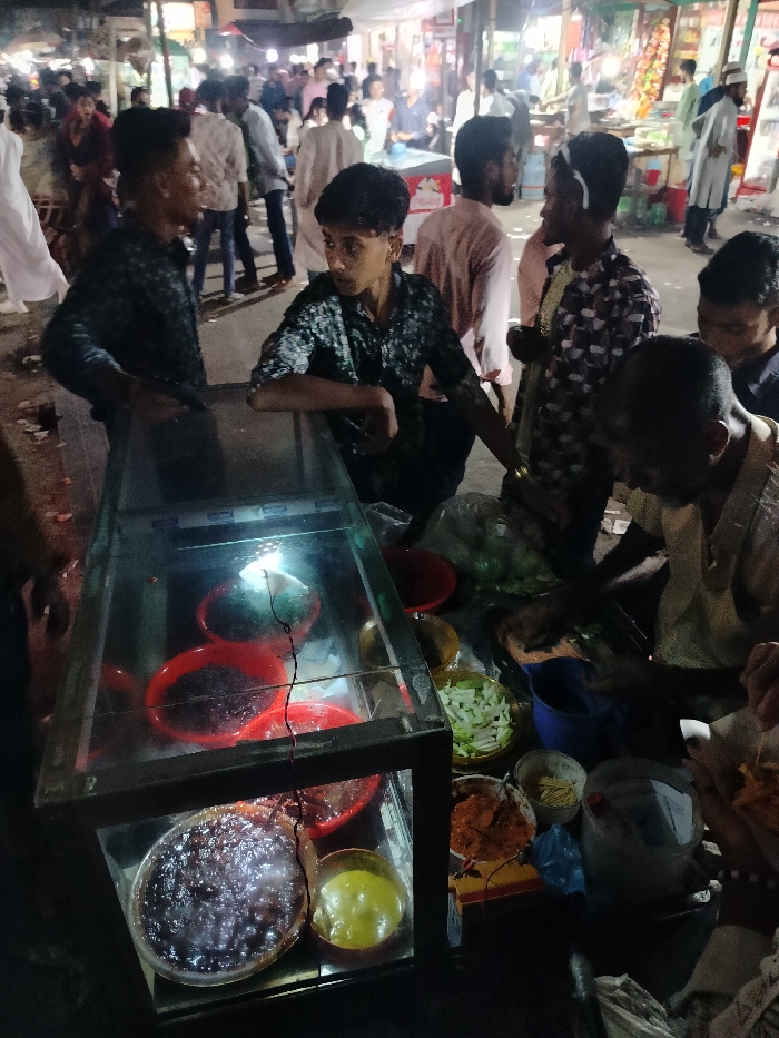 street food vendor in Charfasson Sadar, Bangladesh. The vendor is preparing food inside a glass display case. There are multiple containers of food inside the display case. The vendor is wearing a white shirt and is using a knife to prepare food. There are several people standing around the vendor. The vendor is located in a bustling street in Charfasson Sadar, Bangladesh. People are walking around in the background. The street is lit by street lights. The vendor's stall is illuminated by a light placed inside the display case.
