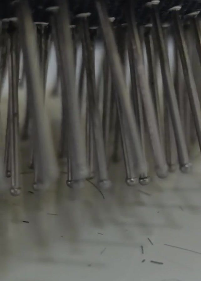 A close-up shot shows the bottom of a hairbrush. The bristles are made of thin, silver-colored metal rods with small ball tips. Scattered underneath the brush are several short strands of hair and some dust particles. The background is a blurry, off-white surface. There is no indication of a person, action, interaction or specific environment beyond what is already provided.