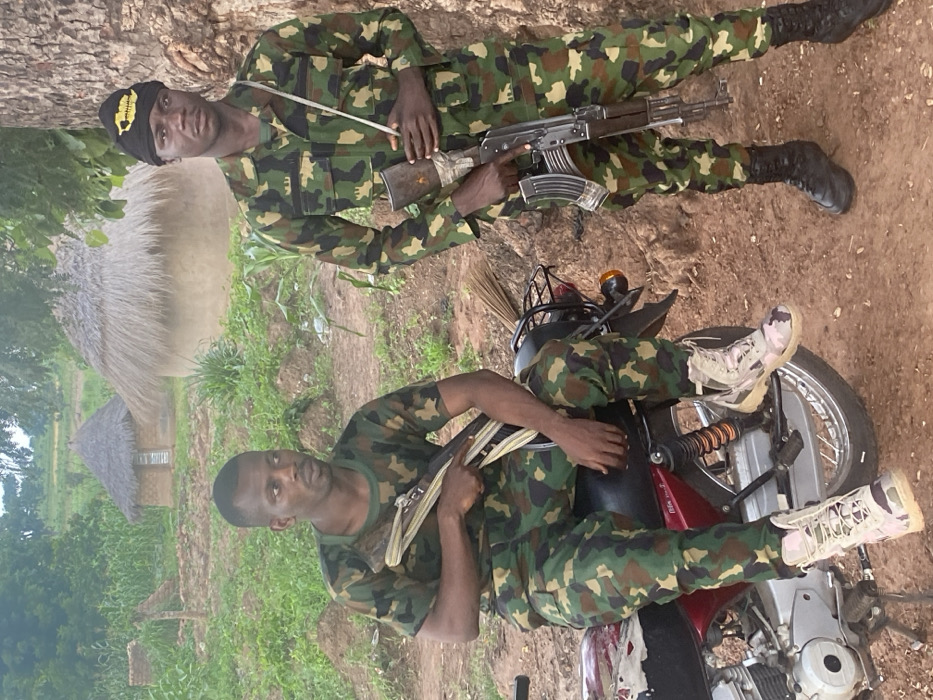 The image depicts two males in camouflage military-pattern uniforms within a rural area of Wukari, Nigeria