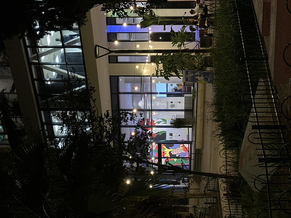 The scene depicts a modern urban plaza in Tel Aviv, Israel, at night. In the foreground, dark foliage, including palm trees and dense bushes, flanks a paved area. A low black metal fence separates a grassy section containing a light-colored, angular ground sculpture. Suspended overhead, a string of warm-toned Edison-style bulbs provides ambient illumination to the plaza, alongside a tall, black, contemporary lamppost. To the right, two women are seated at a small, dark outdoor table, appearing to be engaged in conversation. An A-frame sign with Hebrew text, including the word for "The Exhibition," stands adjacent to the seating. The midground is dominated by a multi-story, modern building featuring extensive glass facades. The ground floor interior is brightly lit, showcasing a vibrant, multi-colored mural or artwork with stylized faces and abstract forms through its leftmost windows. A set of light-colored steps leads to an entrance. The building's facade on the right incorporates vertical strips of blue and green illumination. On an upper floor, also brightly lit, the silhouette of a single individual is visible standing near a window. Prominent light-colored diagonal structural beams are discernible through the glass windows of this upper level. The overall environment suggests a contemporary, active public space during evening hours.