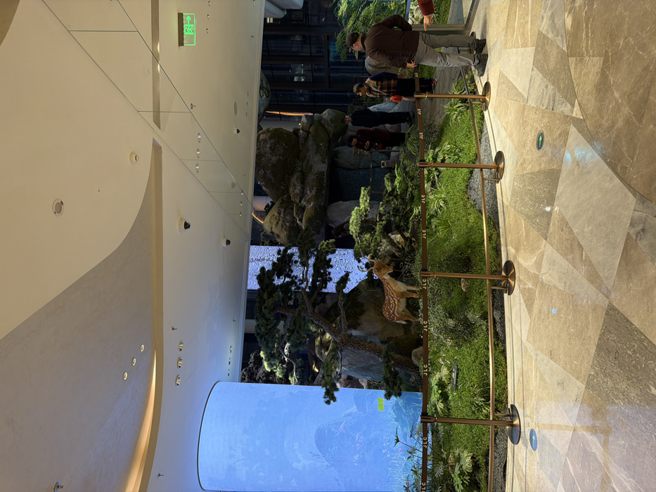 The scene depicts a well-lit indoor public space within the Jinling Hotel, Qinhuai District, Nanjing, China. The floor is covered with polished marble tiles featuring a geometric pattern of varying beige, grey, and brown tones. A bronze-colored stanchion system with retractable black belts, each marked with "JLC" in white, forms a barrier in the mid-foreground, delineating an elaborate artificial landscape exhibit. The exhibit features lush green ground cover resembling moss and small plants, interspersed with several dark green bonsai-style trees. Prominent among these is a life-sized, fawn-colored deer statue with white spots, positioned centrally within the greenery, facing left. Behind the deer, large, moss-covered artificial rocks form an elevated terrain, including a small cave-like opening. To the left of the exhibit, a tall, curved digital display column emits a blue light, displaying abstract or naturalistic patterns. Another vertical digital display screen, integrated into the rockwork on the right, simulates a waterfall effect. Several individuals are present, observing the exhibit. From left to right: one person in a dark coat is partially visible behind the rock formation. Two individuals, one in a dark red jacket and another in dark attire, stand behind the barrier, observing the exhibit. To their right, a person with a patterned scarf and dark clothing also looks towards the display. In the mid-ground right, a male individual wearing a dark brown jacket, grey pants, and a dark cap stands with his back largely to the viewer, facing the exhibit. A hand with a red sleeve is partially visible on the far right, pointing towards the exhibit. The ceiling is high, white, and curvilinear, fitted with recessed spotlights, linear lighting, and multiple security cameras (CCTV). A green emergency exit sign is visible on the upper right wall. Large glass panels or windows in the background reveal an outdoor urban environment, suggesting nighttime or dusk with visible illuminated structures.