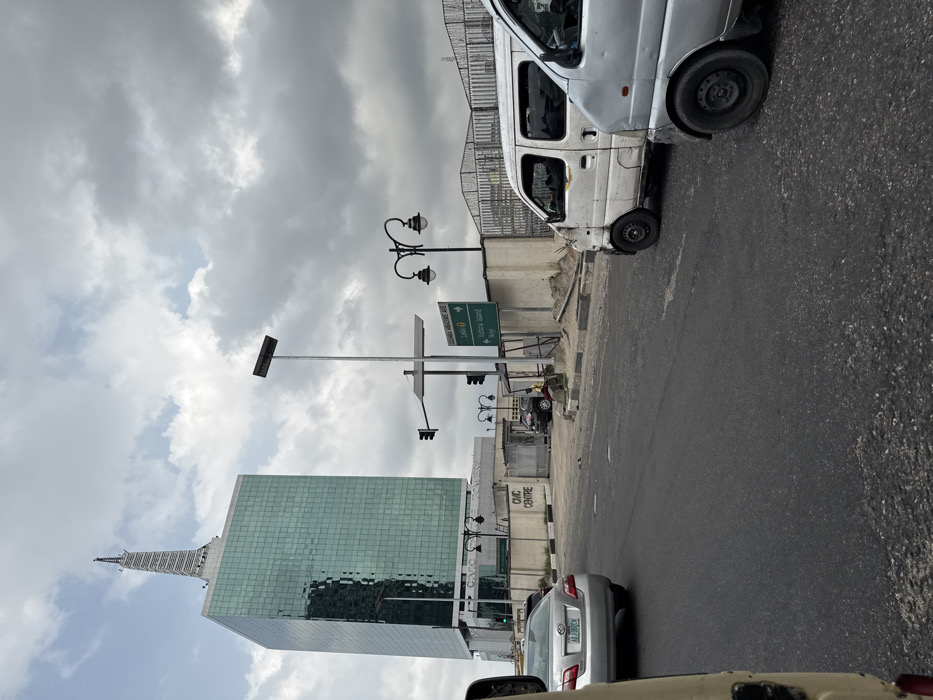 The image depicts an urban street scene under an overcast sky. The scene is situated in the city of Itirin, Nigeria, specifically in a location commonly identified as Lagos, with visible street signs indicating directions to "Victoria Island," "Ikoyi," "Marina," and "Oshoba Melbourne Ave." In the background, a tall, rectangular skyscraper, identifiable as NECOM House, dominates the left side, featuring a green-tinted reflective glass facade and a distinctive, multi-tiered spire at its apex. The building's base displays "CMC TOWERS" and "CMC CENTRE" signage. To the right of the skyscraper, a mix of concrete walls and fences defines the roadside, some appearing worn or damaged. The asphalt road, dark grey with scattered lighter debris, occupies the lower half of the frame. Traffic is present, with vehicles either stopped or moving slowly. On the left, a silver Toyota Camry sedan (license plate AB J08DCX) is visible, facing away from the viewer. Partially visible in the extreme foreground on the left is a cream-colored side panel of another vehicle. On the right side of the road, a white commercial van, exhibiting significant front-end damage including a missing bumper, is parked or stopped. To its right, a silver commercial van, similar in model, is partially visible. Street furniture includes a tall metal pole equipped with a solar panel array and a street lamp, positioned centrally. Further right, an ornate black street lamp with two curved arms and two globes is present. Traffic lights are visible, one hanging from the solar panel pole and another lower to the left. A green overhead road sign with white text provides directional information. One individual, wearing a yellow top and dark trousers, is seated on a low concrete barrier or curb on the right side of the road, beneath the solar panel pole. No specific action or interaction is discernible for this person. The overall environment suggests an active urban area with typical infrastructure and traffic flow.