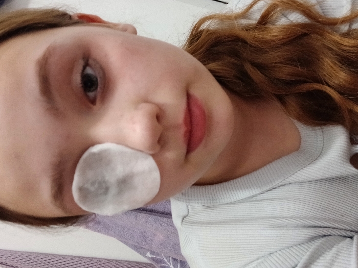A young woman with reddish-brown wavy hair is shown in a close-up selfie. She has fair skin, visible freckles, and her left eye is prominent. A round cotton pad, apparently used for makeup removal, is pressed against her left cheek. Her lips are a muted pink. She is wearing a light-colored ribbed shirt. The background is blurred, showing a hint of what may be a bed or chair. The photo has a slightly rotated perspective.
