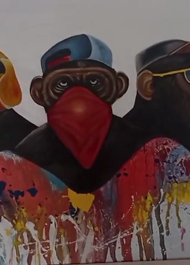 painting of three monkeys. The monkey on the left is wearing a black cap and yellow headphones. The monkey in the center is wearing a backward blue baseball cap and a red bandana over its face. The monkey on the right is wearing a gray cap and yellow sunglasses. Below the monkeys is a splatter of red, yellow, blue, and white paint. The painting is on a white wall near a window.