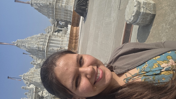 A smiling woman in a green floral top and gray jacket poses. Behind her, the white marble towers of a temple rise against a blue sky. A section of the temple's roof and a decorative stone object are also visible. The image has a slightly rotated orientation.
