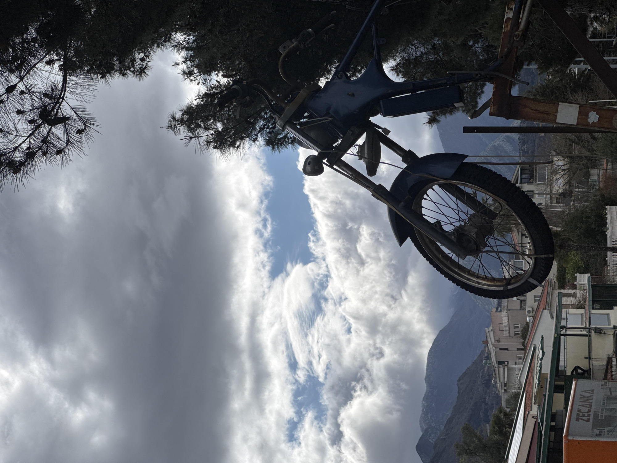 The image depicts an outdoor scene in Bar, Montenegro, under a partially cloudy sky with visible patches of blue. In the foreground, a blue, aged, and partially rusted motorcycle frame, including the front wheel, fender, handlebars, and a single headlight, is mounted on a brown, weathered metal support structure. The motorcycle appears to be part of an outdoor display or art installation. To the right and top, dark green pine trees with visible needles and pinecones frame the upper portion of the scene, silhouetted against the sky. In the midground, several multi-story residential buildings with red-tiled roofs and balconies are visible, interspersed with greenery. An orange commercial vehicle, possibly a truck or van, with "ZECANKA" text on its side, is partially visible on the far left. The background features distant, rugged mountains, some with visible snow or white caps, appearing dark blue and grey under the cloud cover. The overall lighting suggests daylight. No individuals are present.