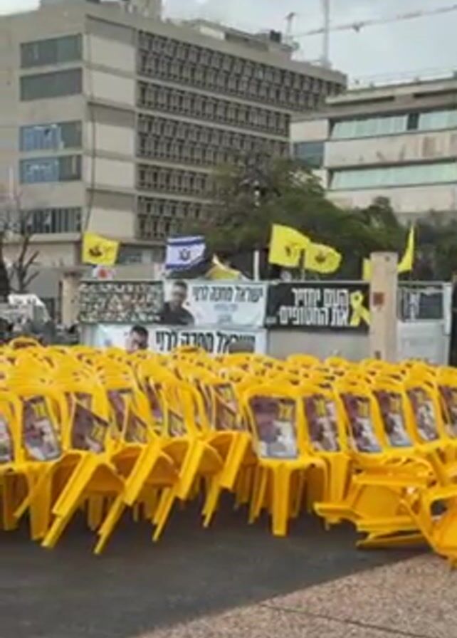 public demonstration or memorial site with numerous yellow plastic chairs arranged in rows. Each chair has a printed image attached to the backrest. Behind the chairs are banners and posters with Hebrew text and images of individuals. In the background are tall buildings and construction cranes under a cloudy sky. There are no people visible in the video frame.