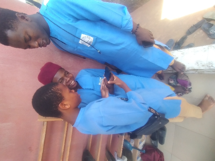 Three male individuals are observed standing on a light-colored tiled floor against a reddish-brown wall in Idimu, Nigeria