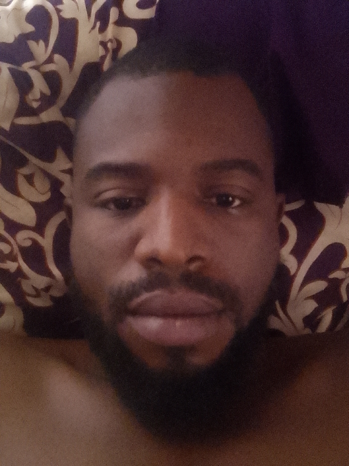 A close-up, head-and-shoulders portrait depicts an adult male with dark skin, short dark hair, and a full beard. He is positioned facing forward, looking directly at the camera. His bare shoulders are visible in the lower portion of the frame, suggesting he is shirtless or partially clothed. The subject appears to be reclining, with his head resting against bedding or pillows that feature a pattern of light-colored, possibly gold or beige, ornate curvilinear motifs on a dark purple background. The scene is set indoors, consistent with a private residence or bedroom in the city of Unknown, Unknown. No other individuals or objects are present within the frame. The lighting is moderate and ambient.