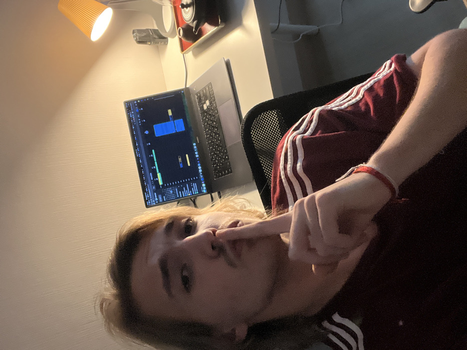An individual with light-colored, shoulder-length hair and a mustache is depicted in a medium close-up, making a "shush" gesture by placing their right index finger vertically over their closed lips while looking directly at the camera. The person is seated in a black mesh-backed chair, wearing a maroon t-shirt with three white stripes on the right shoulder and sleeve. A red string bracelet is visible on their right wrist. To the immediate right, on a white desk, a silver laptop with its screen illuminated displays a dark-themed interface, consistent with a digital audio workstation or video editing software, featuring timelines and graphical elements. Further right on the desk, an orange-ribbed desk lamp emits warm light, illuminating a dark teapot and a matching cup set on a red lacquered tray. The background is a plain, light-colored wall. The scene is located in Samrong Nuea Subdistrict Municipality, Thailand.