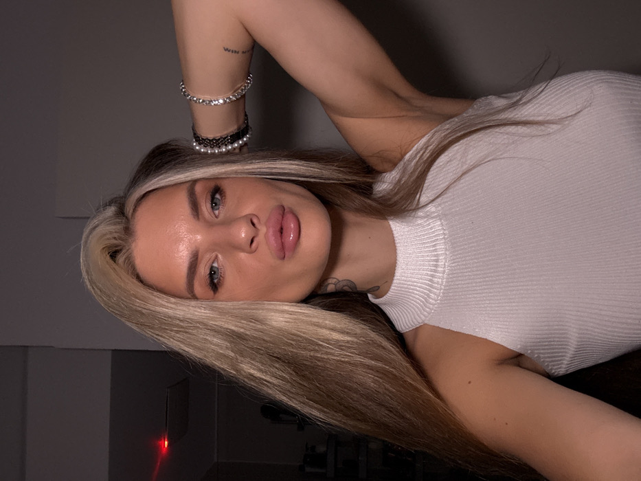 An indoor, close-up photograph features a female individual identified as being in Berlin, Germany. The subject is positioned facing forward, looking directly into the camera with a slight pout, her lips appearing full. She has long, blonde hair with darker roots, styled loose and flowing over her shoulders. Her eyes are blue, and her skin tone is fair. She wears a white, ribbed, sleeveless top with a high neckline. On her right wrist, she wears several bracelets: one composed of white, pearl-like beads, one with dark beads, and another silver-toned with clear, reflective stones. A faint tattoo of text is visible on the inner aspect of her right upper arm, near the elbow. A darker, circular tattoo is present on the left side of her neck, partially obscured by her hair. Her right arm is raised, with the hand out of frame behind her head. The background is dimly lit and out of focus, revealing vague shapes of furniture or shelving on the left side and a small, red light source in the upper left corner, possibly an electronic indicator.