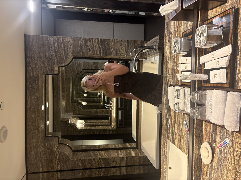 A woman in a brown strapless dress takes a photo of herself in a hotel bathroom with multiple mirrors creating an infinity effect. The bathroom has a luxurious design, featuring marble countertops, a large bathtub, and neatly arranged toiletries, including towels, glasses, and soaps, as well as a tube of Colgate toothpaste. The woman is holding her phone up to capture the reflection of the repeating mirrored images.