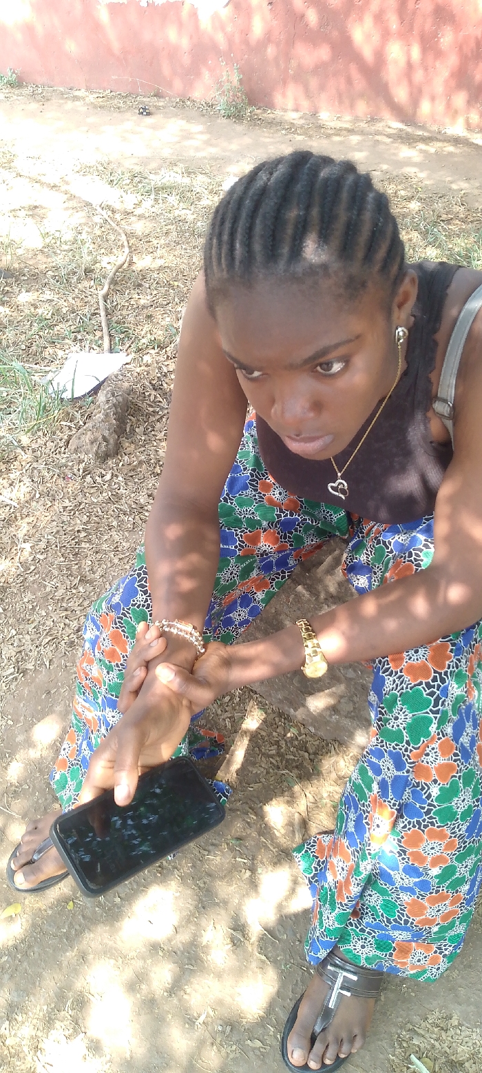 A female individual is depicted outdoors, seated or squatting, likely in Nsukka, Nigeria, viewed from a high angle