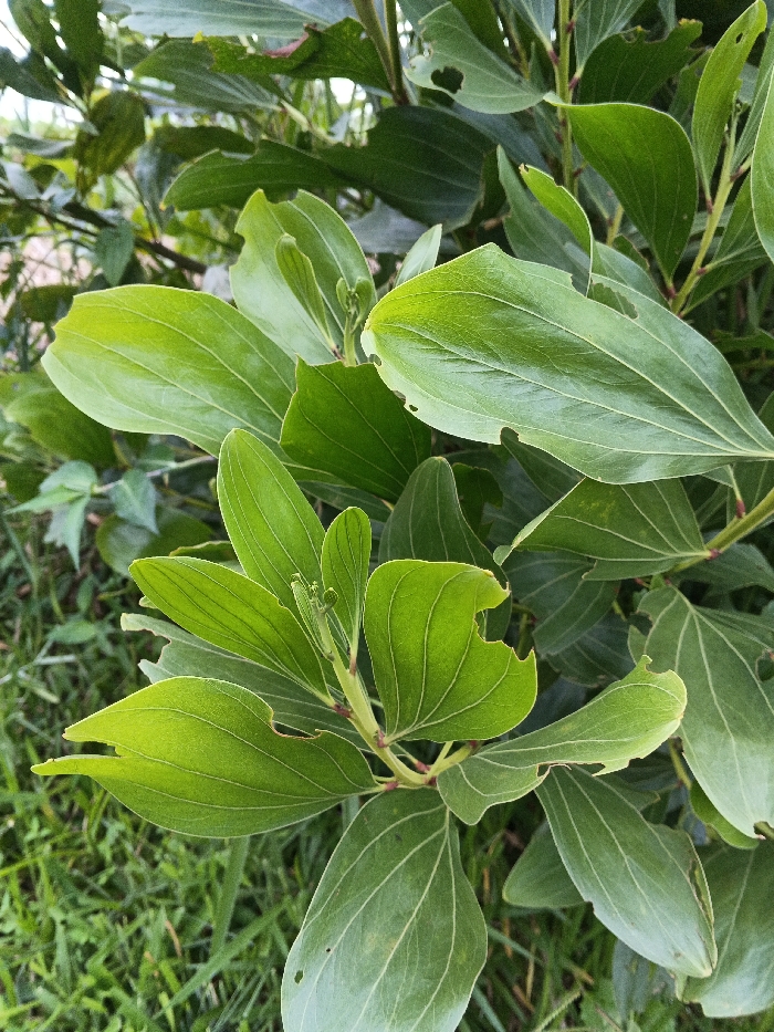 The image displays a close-up of a green-leafed plant in an outdoor environment. Multiple ovate to lanceolate leaves are visible, characterized by their vibrant green color and prominent venation. A significant number of these leaves exhibit irregular perforations and ragged edges, consistent with damage from insect feeding or other herbivory. New, smaller leaves or buds are observed clustered at the terminal end of a central stem. The plant's stems are visible, varying from reddish-brown to green. The background is out-of-focus, revealing additional green foliage and patches of green grass in the lower portion of the frame. No individuals, animals, or specific man-made structures are present within the scene. The precise location within Chengdu, China, is not discernible from the visual information provided.