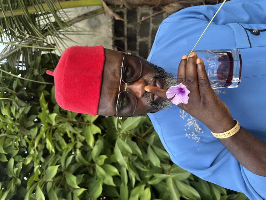 An adult male with dark skin and a grey-streaked beard is depicted in an outdoor setting in Ado, Nigeria. He wears a solid red, peaked cap and aviator-style sunglasses with gold-toned frames. His attire includes a light blue, long-sleeved tunic shirt featuring black trim on a breast pocket. His left index finger is pressed vertically against his lips in a "shush" gesture. His right hand holds a clear, faceted glass containing a dark red liquid, partially obscured by a single purple, trumpet-shaped flower with a green stem, also held in his right hand. A beige wristband with dark script, identifiable as Hebrew ("יהוה אחד"), is visible on his left wrist. The background consists of dense green foliage on the left and upper left, while the right side reveals glimpses of a grey block wall and dried palm fronds.