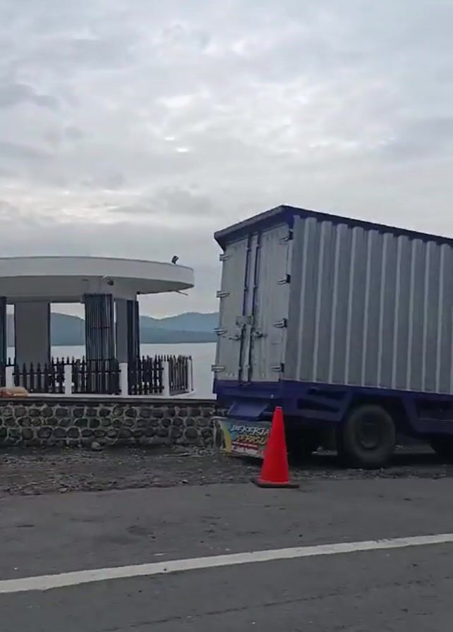 seaside view in Indonesia with a roadside statue of a traditional dancer figure. Motorcycles and several vehicles, including a small truck, a white hatchback car, and a dark SUV, are seen driving by or parked. People are standing along the roadside, looking out at the water. The weather is overcast, and the water appears calm. The camera moves, capturing the scene from a passing vehicle.
