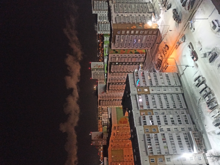 A nighttime view of a city with multiple residential buildings, lined up along a road. Many cars parked beside the buildings are covered in snow. The buildings are illuminated, some with decorative lights. A trail of smoke or cloud extends vertically into the dark sky. The image has been rotated.