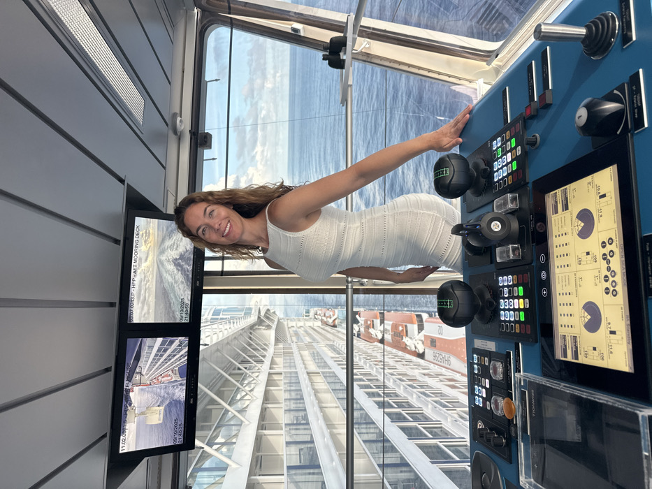 An interior photograph captured on the navigation bridge of a large vessel depicts one female subject, approximately mid-30s to early 40s, with long wavy brown hair, smiling directly at the camera