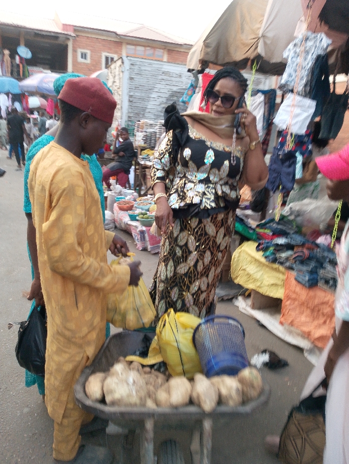 In a bustling outdoor market, a man in traditional yellow attire and a red cap loads yams and bags into a wheelbarrow. A woman in a glitzy top, long skirt, and sunglasses talks on her mobile phone nearby. Clothes are displayed in the background. Other shoppers and vendors move about in the busy scene, suggesting a vibrant commercial atmosphere.