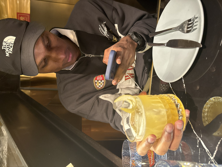 The image depicts an adult male seated at a dark, marble-patterned table within an indoor commercial establishment in Chaoyang District, China. The individual wears a black baseball cap with "THE NORTH FACE" in white text and a dark grey zip-up jacket featuring white chest and sleeve panels. A checkered flag logo with "International America Tour" text is on the wearer's left chest, and white cursive text, possibly "Holden," is on the wearer's right chest. A black digital watch is present on his left wrist. He is focused downwards, looking at a blue-cased mobile phone held in his right hand. Concurrently, he holds a clear, textured glass containing a yellow liquid cocktail garnished with a lemon peel in his left hand. On the table, a white ceramic plate holds a silver knife and fork. A partially visible second clear glass with an orange-red design is to the left. The background includes dark structural elements, a warm metallic wall, and a red sign with white Chinese characters.
